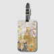 A vintage luggage tag that features Thailand that has the golden spires landmark, a vehicle, flowers, a Buddha statue, with lanterns, cogs and a background full of newspapers