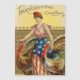 Original vintage Thanksgiving greeting illustration with a woman and turkeys.