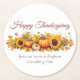 This old fashioned company holiday party coaster features a vintage drawing of orange pumpkins, fall leaves, and cute autumn sunflowers. Nostalgic Happy Thanksgiving decor with brown script of your business name and personalized professional message on the back for clients and friends.