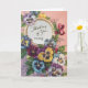 A vintage greeting card image that says "Thinking of You Today" inside an image of embroidery hoop. Surrounding the hoop are beautiful pansies in white, yellow, purple and lavender. The message inside the card is "Just sending this note to keep in touch and say I miss you ever so much."