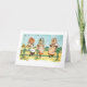 A vintage illustration of three little girls sitting and chatting on a wooden fence in a meadow filled with hay stacks. The girl on the right has her arms crossed over her chest and a bit of a pouty look on her face as if she takes offense at something one of the others has said or done. Girls will be girls! The card is blank inside for your handwritten message.