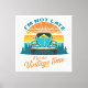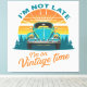 Vintage Time Ride T-Shirt. A retro-style illustration featuring a classic turquoise Beetle car in front of a vibrant sunset, surrounded by pine trees. The text humorously reads “I’m not late, I’m on vintage time,” highlighting a nostalgic and playful vibe.