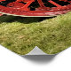 A photographic design of a red vintage steam traction engine.