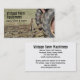 A close-up photograph of the rear wheels of an old red tractor towing a harrow, harrowing a field in winter sunshine, on a business card template for sales, spare & repairs of farm machinery and implements etc