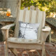 A throw pillow with a vintage black and white etching of a tropical beach with palm trees, fluffy clouds and the ocean on the horizon. Customize It to add your name or message, change background colors and more.