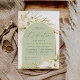 Tropical chic baby dedication invitations in an alluring neutral color palette feature a rose gold foil arch bearing your church ceremony and celebration or party details, accented with pale green watercolor palm fronds, beachy island foliage, white orchids, boho dried botanicals and pampas grass.