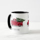 Celebrate the Christmas season with this mug featuring a cute vintage red pickup truck hauling a green snow covered Christmas tree. Add a custom initial in black script and your name in black hand written font. Makes a great personalized Christmas gift for family, friends and co-workers. Designed by © Tim Coffey.