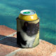 Can Cooler featuring a darling tuxedo kitten! This black and white kitten cutely poses on green and red blankets. A wonderful gift for cat lovers and Victorian art enthusiasts!