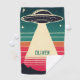 Rep your love for golf and extraterrestrial things with this personalized golf towel. This eye-catching design features a vintage grunge scene of a UFO soaring through a mesmerizing sunset. Stars twinkle in the dark upper sky, while the fiery red horizon casts a dramatic silhouette on the landscape below.