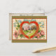 Beautifully restore antique Valentine greeting featuring a couple in a country scene framed by a red heart embellished with pink cherry blossoms and a blue satin ribbon on a pink gingham background.