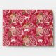 A romantic and nostalgic Valentine's Day pattern featuring intricate white lace hearts filled with pink roses and playful cupids. The design is set against a vibrant red background with a subtle floral pattern. Perfect for creating cards, wrapping paper, and other Valentine's Day projects.