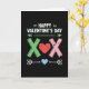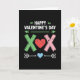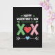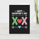 This card shows a deep black background with a big “XOX” design in the center. The left X is forest green, the right X is blush pink, and a red heart sits between them like the “O,” giving it a sweet, romantic focus ❤️. The shapes have a slightly worn, printed texture that makes the design feel warm and real instead of flat. At the top, the text “HAPPY VALENTINE’S DAY” appears in white, in simple all-caps letters, with green arrows on both sides pointing inward. Below the “XOX,” there’s a small sky-blue heart with two white arrows going through it, like a classic Cupid touch. The mix of hearts, arrows, and the hug-like layout of the letters makes it feel easy to give to a partner or a close friend 🥰. It’s a straightforward way to say “I care about you” without needing a lot of extra words, and it’s perfect for sharing Valentine’s Day sentiments.