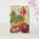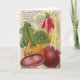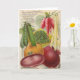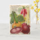 A vintage advertisement for mail order vegetable seeds says, "Seven Grand Vegetables - The Cream of Latest Novelties. One packet of each variety to any address for only 25 cents." The vegetable varieties included are radishes, wax beans, spinach, yellow onions, turnips, beets and peas. This card is blank inside for your own message.