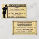 This elegant business card features the silhouette of a Victorian gentleman in a top hat and suit. He's leaning against a sign where you can fill in your company name, your name, your title, your phone and your email. The front of the card also has a flourish design on top and surrounding your company name and your name. The back of the card has a border with corner flourishes and spaces for you to list your services, add a short quotation and include your business address and website. The background has a yellowed, antique old-paper look. This would make a stylish business card for anyone looking for a unique, old-fashioned -- yet professional -- look.