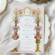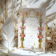 This stunning wedding save-the-date card features a luxurious blend of colors and intricate floral details inspired by Art Nouveau style. The front showcases a lush floral arrangement of pink, red, and lavender blooms in elegant golden vases, accentuated by vibrant green stems. At the top, delicate golden filigree, adorned with botanical motifs and touches of blue, pink, and gold, surrounds the couple's initials. The soft pastel background enhances the rich details of the florals and gives a refined and sophisticated feel. The reverse side features an intricate gold geometric pattern, adding a timeless and elegant touch to the card’s design. Perfect for couples looking to announce their wedding date with a touch of classic charm, blending modern elegance with the beauty of nature.