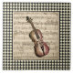 Vintage violin illustration with subtle coloring on background of antique sheet music and harlequin pattern border