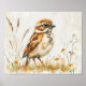 This charming art print features a detailed watercolor painting of a sparrow amidst a field of wildflowers and grasses. The soft, vintage tones and delicate brushwork bring a touch of nature's beauty to any room. Perfect for bird lovers and those who appreciate rustic, natural decor. Elevate your space with this exquisite piece of wall art.