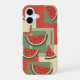 Retro pattern featuring large watermelon slices placed on geometric blocks in a soft red-green palette.