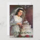 Vintage illustration love and romance design featuring a happy bride in her wedding gown with lace veil. She is cutting her wedding cake decorated with red roses and other flowers at the reception.