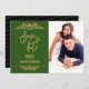 Bronze, Forest Green and Black Wedding Save the Date photo card with cursive handwriting script customizable to your event specifics. Sample image has been used with permission.