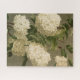 This challenging and very pretty puzzle has a vintage close up image of hydrangea blossoms with leaves in pretty shaded green.