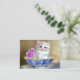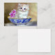 Enclosure Cards featuring a fluffy white kitten! The blue eyed kitten sits in a blue bowl with pink flowers. A purple flowered blanket is draped in front. A marvelous gift for cat lovers and Victorian art enthusiasts!