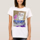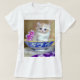 T-Shirt featuring a fluffy white kitten! The blue eyed kitten sits in a blue bowl with pink flowers. A purple flowered blanket is draped in front. A marvelous gift for cat lovers and Victorian art enthusiasts!