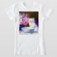 T-Shirt featuring a beautiful white kitten wearing a purple ribbon! This fluffy kitty poses next to a blue bowl and a vase of pink, purple, and white flowers. A marvelous gift for cat lovers and Victorian art enthusiasts!
