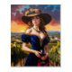 Colorful vintage fine art painting featuring a pretty lady with a glass of red wine in an Italian vineyard landscape scene at sunset.