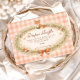 A charming woodland-inspired baby shower design featuring a sweet watercolor fox resting above a delicate floral wreath. Soft greenery, tiny mushrooms, and wildflowers create a cozy forest frame, finished with a warm bow and a soft peach gingham background. The vintage storybook illustration style and gentle earthy palette give the design a whimsical woodland nursery feel, perfect for celebrating a little one in a warm and magical forest setting.