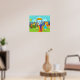 This Vintage Zoo Poster shows a 1950's, classic television style family on a weekend excursion. This mid century modern, minimalist art design features a cartoon drawing of a perfect day at the zoo. Yes, it's a beautiful day for a family outing and you've come to the right place. Step through the wrought iron gate, beneath the yellow sign with red lettering that says, "ZOO." Once inside, you'll see an orange, stone pathway flanked by lush, green grass. In a large cage, you'll notice the majestic lion. This orange and yellow king of the jungle is keeping his eyes on an adorable, blonde girl in a pink dress, who, coincidentally, is keeping her eyes on him. On the opposite side of the walkway, you can't miss the towering, yellow and brown giraffe in a round enclosure. He is at eye level with the swaying palm tree in the background. A young, boyish scamp wearing a bright, red shirt and blue jeans is in a hurry to get somewhere. Oh, my! It looks like he's making a beeline to a zookeeper. The keeper of the zoo is dressed appropriately in khaki shorts, shirt, and hat. What's that he's holding? A monkey! And what's that the money is holding? A banana! Folks, it does not better than this! Standing on the walkway, we see Dad. Whew! I'm glad to see he knows it pays to look your best, even on a day off from the office. He is wearing a blue suit, light blue shirt and red tie. Dad is handing off three balloons, in shades of orange, blue and red to Mom. Mom is wearing a blue dress with a form fitting bodice and flared skirt. Her flippy, blonde hairstyle is most becoming. The sky is shades of aqua, teal and blue and is filled with magical, white stars. Just like the zoo itself, this design is fun for the whole family and is perfect for children of all ages.
