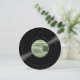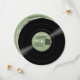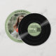 A retro vinyl record style round paper Save the Date card for your wedding with a soft greenlabel. This fun custom card features a vinyl record image on one side with an album title "Save the Date" in a retro script and your names. It has all the essential details: date, location, website (text and QR code).