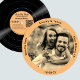 A retro vinyl record style round paper Save the Date card for your wedding with a sandy apricot label. This fun custom card features a vinyl record image on one side with an album title "Save the Date" in a retro script and your names. It has all the essential details: date, location, website (text and QR code).