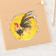 Rooster strutting before a yellow sun. Cockscomb is bright red, feathers are shades of green and oranges. Original ceramic Art by Nora Chen.
