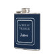 Vinyl wrapped flask is shown in a solid color of navy blue with a sample father of the bride name.