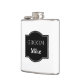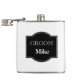 Vinyl wrapped flask is shown in a black and white design with a sample groom name.