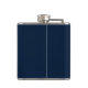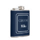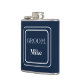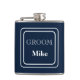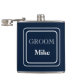 Vinyl wrapped flask is shown in a solid color of navy blue with a sample groom name.