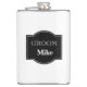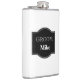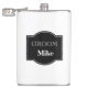 Vinyl wrapped flask is shown in a black and white design with a sample groom name.