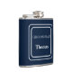 Vinyl wrapped flask is shown in a solid color of navy blue with a sample groomsman name.