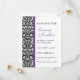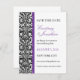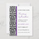 A black-and-white damask wallpaper pattern along with royal purple accents serve to highlight this invitation. Easily personalized with your name(s), event date and information. The back is intentionally left blank. Available in alternate colors with matching favors, postcards and invitations
