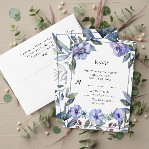 wedding program. Beautiful watercolor painted image of purple anemone flower, shades of blue violet and purple, a lovely still life scene perfect for an elegant modern flower garden wedding in the summer.