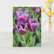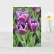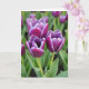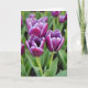 This card features a close-up photo of three partly opened flowers clustered together in the foreground, their layered petals a deep violet with a crisp white edge that traces each curve like a gentle outline. The blossoms lean toward one another as if sharing a quiet moment, creating a soft, romantic closeness ❤️. Behind them, leafy greens and a scattering of other blooms fade into a smooth blur of muted green and faint purple, keeping the focus on the trio. Natural, diffused light falls across the petals, showing silky texture and fine lines that run inward toward the centers. A subtle magenta tint appears at a few petal tips, adding a tender, almost blushing accent 🌼. The greeting text sits near the top in a simple white font, with a smaller line placed near the bottom in pale gray for balance. Pale green stems rise from the lower edge and angle slightly left, anchoring the flowers against the softly blurred garden background.