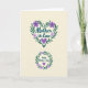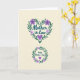 Designed with a soft, creamy background, this card features two botanical wreath designs that feel like a quiet embrace ❤️. Near the top, a heart-shaped wreath of slender deep-green leaves and tiny five-petaled flowers in lavender and violet surrounds a message set in teal lettering, giving the words a gentle, affectionate presence. A small solid purple heart sits at the bottom point of the wreath, like a tender punctuation mark. Lower on the card, a smaller circular wreath repeats the same leafy sprigs and purple blooms, creating a sweet sense of closeness between the two designs 🌼. Inside this lower wreath, a short greeting appears in matching teal lettering, with another small purple heart placed beneath the text. The two text areas are centered within their wreaths, spaced with plenty of open background so the eye moves calmly from top to bottom. Fine linework defines the leaves and petals, and the purples and greens remain softly shaded against the creamy field. The upper wreath is distinctly heart-shaped while the lower wreath is round, both outlined by deep-green stems dotted with violet blossoms.