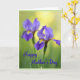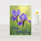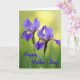 This card features a close-up photo of two purple flowers set against a softly blurred garden background. The main bloom on the right looks velvety and detailed, with rich violet petals and a gentle yellow-and-white pattern near the center that feels like a tender, affectionate touch ❤️. A second flower sits to the left in the distance, slightly out of focus, like a quiet companion that makes the scene feel like a warm pair. Behind them, soft green and golden tones glow like late-afternoon light, giving the image a calm, sunlit setting. Along the lower part of the design, the words “Happy Mother’s Day” appear in deep purple, flowing lettering that matches the flowers. The text stretches across the bottom without covering the main bloom, leaving the petals and their delicate markings easy to admire 🌼. The background fades into smooth circles of light in emerald and pale gold, while the right flower’s crest shows crisp yellow-white accents against violet.