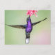 Postcard featuring the beautiful violet sabrewing hummingbird feeding from a pink flower with its wings outstretched. This stunning hummingbird is rather large, with deep purple feathers and white tips on its outer tail feathers. Unique and beautiful card for hummingbird, garden and nature lovers. Photo taken at Bosque de Paz Reserva Biologica, Valle del Rio Toro, Alajuela, Costa Rica.