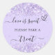 A stylish violet, lavender colored background, decorated with confetti. With the text: Love is sweet, please take a treat, with a small heart. Personalize and add your names.