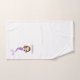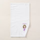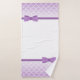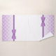 Pretty girl's bath towel set featuring violet mermaid scales. The hand towel is done in white with a cartoon brunette and purple mermaid and purple custom text ready to personalize. The bath towel is done in white, with violet scales, on both ends of the towel, with a purple band and bow border. Lovely towel set for any young girl.
