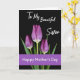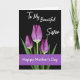 Designed with three tall flower buds that resemble tulips, the image shows deep purple petals shaded from violet to plum, rising on rich green stems and long leaves. A dark black background makes the blooms glow, and the soft light catches fine lines in the petals and a pale edge near their bases, like a gentle touch between close family members ❤️. Near the top, the words “To My Beautiful Sister” appear in thin, flowing white lettering, floating above the flowers. The spacing gives the message room to breathe, keeping the focus on the trio of blooms below. Along the bottom runs a wide purple band that matches the petals, creating a calm frame for the design. Inside that band, “Happy Mother’s Day” is set in crisp white text that stands out clearly against the purple. The three purple buds sit centered against the black field, with green leaves fanning outward beneath them 🌼.