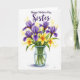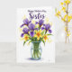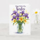 This card features a neatly arranged bouquet centered on a bright white background, with tall purple blooms opening their petals around sunny yellow centers. Between them sit small five-petaled yellow flowers that lean toward one another like close friends, adding a gentle, affectionate warmth ❤️. The stems gather closely inside a clear glass vase, and the see-through surface lets the fresh green lines show through. A faint aqua tint hugs the rim and base of the vase, giving the arrangement a calm, grounded look. Soft glowing yellow dots float in the background like scattered light, adding a dreamy sparkle 🌼. Near the top, a short message is placed above the flowers in deep violet lettering, with a flowing line paired with a classic printed style. The purple petals show subtle shading along their folds, and the vase has light reflections along its curved sides.