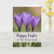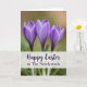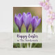 This card features three violet blossoms in the center, their petals shaded from pale lavender at the edges to deeper purple with fine vein-like lines, like a close-knit trio leaning toward one another 🌷. Tiny orange centers glow from inside each bloom, adding a warm spark against the cooler purples. The flowers sit on thin green stems that rise from a softly blurred foreground, giving the scene a gentle, intimate focus. Behind them, the background fades into a smooth wash of leafy greens and muted earth tones, like a quiet garden where a couple might stroll side by side 🐇. A translucent white banner stretches horizontally across the lower portion of the image, creating space for the greeting without covering the main blossoms. The message “Happy Easter to The Newlyweds” is centered on the banner in dark lettering, with “Happy Easter” in a flowing cursive-style font and the rest in a simple serif style. Soft, diffused light highlights the silky texture of the petals, and the banner’s edges blend lightly into the green blur behind it.